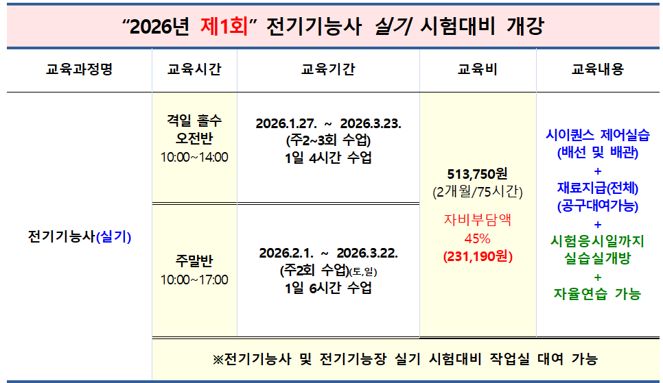 2026년 제1회 전기기능사 "실기" 시험대비 개강 작성자대전전기학원|작성시간26.01.02|조회수119 목록 댓글 0 글자크기 작게가 글자크기 크게가 다음검색 현재 게시글 추가 기능 열기 북마크 공유하기 신고 센터로 신고 댓글 댓글 0 댓글쓰기 답글쓰기 댓글 리스트