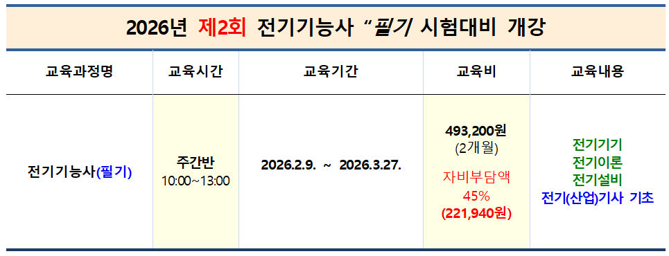 2026년 제2회 전기기능사 필기시험대비 개강안내 작성자대전전기학원|작성시간26.01.02|조회수80 목록 댓글 0 글자크기 작게가 글자크기 크게가 다음검색 현재 게시글 추가 기능 열기 북마크 공유하기 신고 센터로 신고 댓글 댓글 0 댓글쓰기 답글쓰기 댓글 리스트