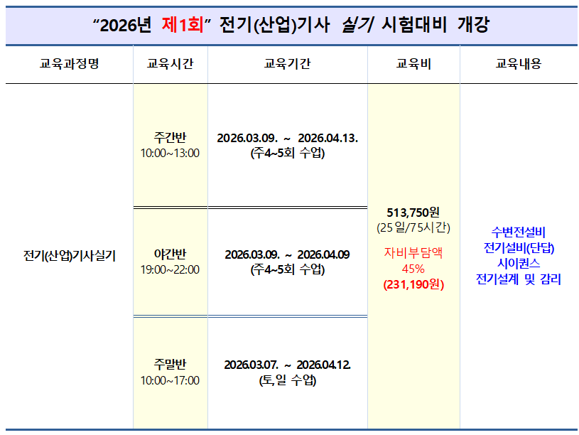 2026년 제1회 전기(산업)기사 실기 개강안내 작성자대전전기학원|작성시간26.01.02|조회수124 목록 댓글 0 글자크기 작게가 글자크기 크게가 다음검색 현재 게시글 추가 기능 열기 북마크 공유하기 신고 센터로 신고 댓글 댓글 0 댓글쓰기 답글쓰기 댓글 리스트