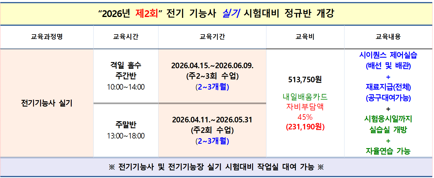 2026년 "2회" 전기기능사 "실기"시험대비 개강 작성자대전전기학원|작성시간26.03.17|조회수29 목록 댓글 0 글자크기 작게가 글자크기 크게가 다음검색 현재 게시글 추가 기능 열기 북마크 공유하기 신고 센터로 신고 댓글 댓글 0 댓글쓰기 답글쓰기 댓글 리스트