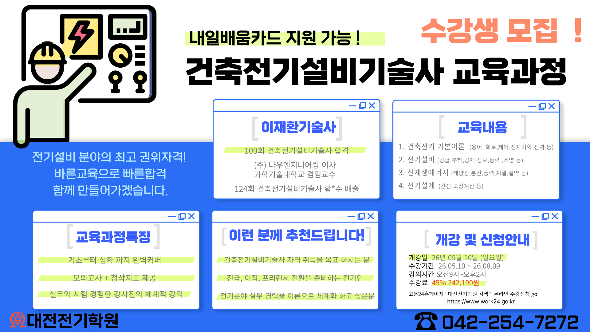 2026년 건축전기설비 기술사 개강안내 작성자대전전기학원|작성시간26.03.23|조회수57 목록 댓글 0 글자크기 작게가 글자크기 크게가 클릭하심녀 더 선명하게 보실 수 있습니다.개강날짜: 26년 5월 10일 (일요일)강의시간 : 일요일(주1 회) 오전9시~오후2시 (1일 5시간) 다음검색 현재 게시글 추가 기능 열기 북마크 공유하기 신고 센터로 신고 댓글 댓글 0 댓글쓰기 답글쓰기 댓글 리스트