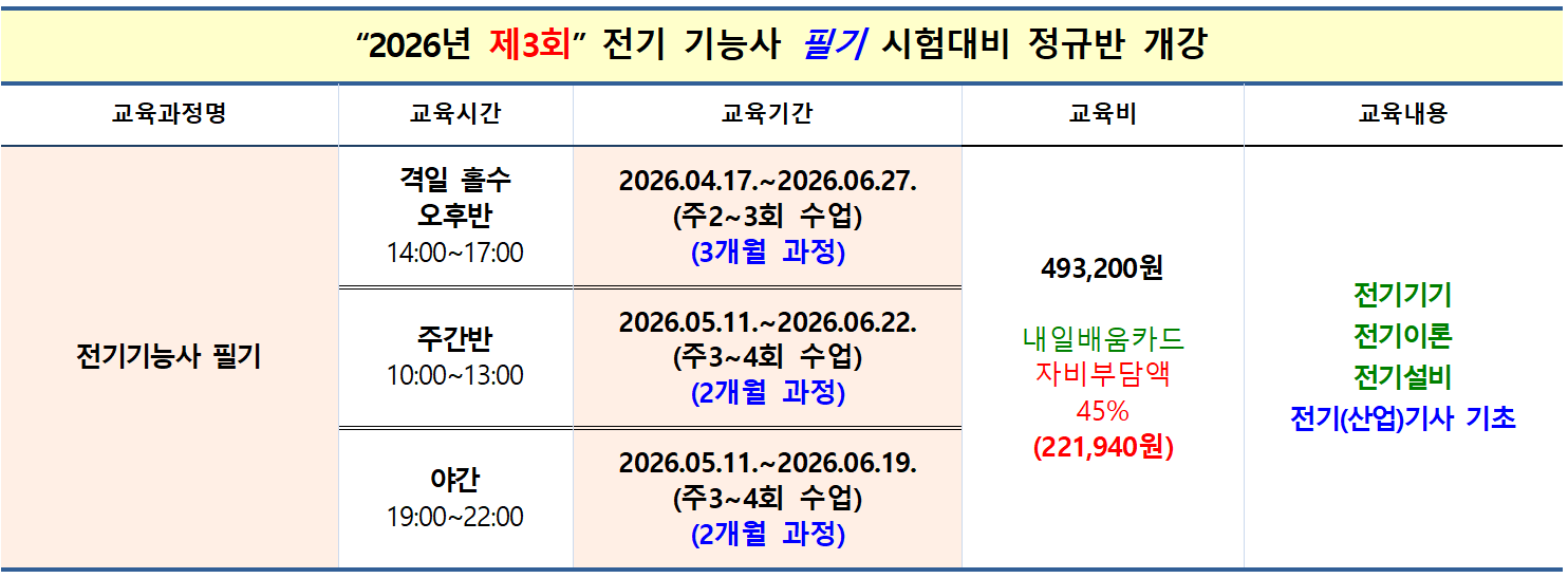 2026년 "3회" 전기 기능사 "필기" 시험대비 개강 작성자대전전기학원|작성시간26.04.03|조회수15 목록 댓글 0 글자크기 작게가 글자크기 크게가 다음검색 현재 게시글 추가 기능 열기 북마크 공유하기 신고 센터로 신고 댓글 댓글 0 댓글쓰기 답글쓰기 댓글 리스트
