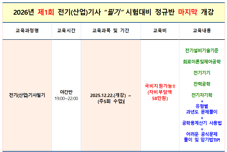 2026년 전기(산업)기사 "필기" 시험대비 마지막 개강!! 작성자대전전기학원|작성시간25.11.19|조회수157 목록 댓글 0 글자크기 작게가 글자크기 크게가 다음검색 현재 게시글 추가 기능 열기 북마크 공유하기 신고 센터로 신고 댓글 댓글 0 댓글쓰기 답글쓰기 댓글 리스트