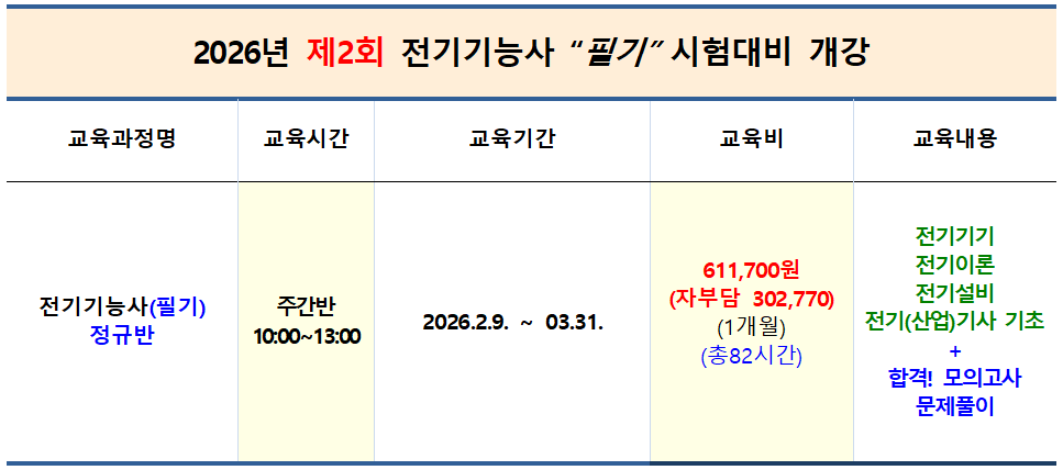 2026년 제2회 전기기능사 필기시험대비 개강안내 작성자대전전기학원|작성시간26.01.02|조회수126 목록 댓글 0 글자크기 작게가 글자크기 크게가 다음검색 현재 게시글 추가 기능 열기 북마크 공유하기 신고 센터로 신고 댓글 댓글 0 댓글쓰기 답글쓰기 댓글 리스트