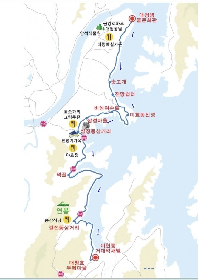 대전시 대덕구 미호동 대청댐 물문화관 → 숫고개 → 제 1보조댐 → 미호동산성(지명산) → 비상여수로댐 → 삼정동(이촌·강촌마을) → 민평기 가옥 → 덕골 → 갈전동 송강식당 → 대전 대덕구 이현동 (배고개 :두메마을)