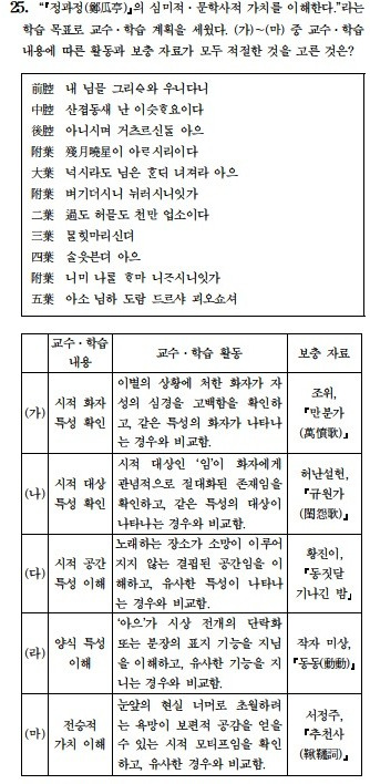 작성자오토바이 작성시간 13.09.07 이러한 예를 윤선도의 '오우가'에서 보면 진정한 벗에 대한 화자의 관념에는 변합없는 존재로 '수,석,송,죽,달'이 관념화되어 있는 것을 볼 수 있습니다. / 참고로 이 문제의 함정은 '교수학습 내용과 보충자료가 모두'라고 한 질문에서 '모두'에 있습니다. 보충자료는 암기해야 할 내용이지만 (가)에 대한 분석은 본문이 제시되어 있는 것이므로 이 작품에 대한 판단이 우선되어야 한다는 출제의도를 알 수 있네요. 보충 자료는 함정으로 제시된 내용이라고 볼 수 있습니다.