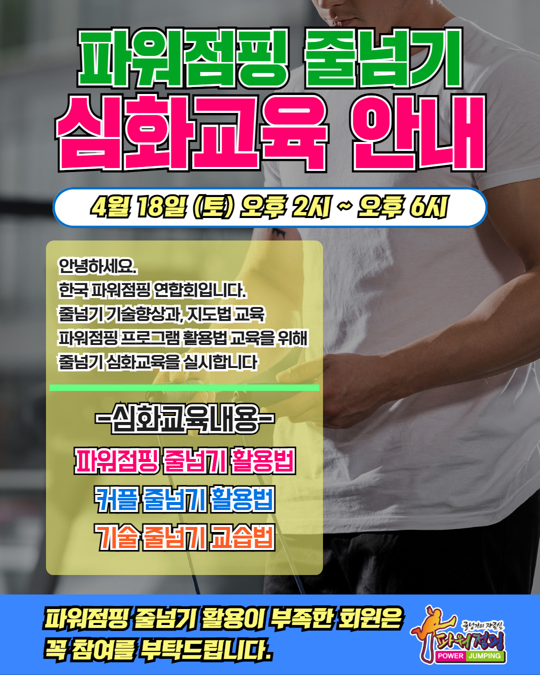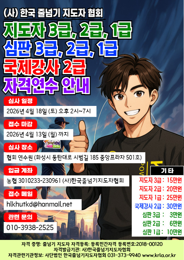 (4/18) 사)한국 줄넘기 지도자 협회 지도자 3급, 2급, 1급, 심판, 국제강사 2급 자격 강습회 안내