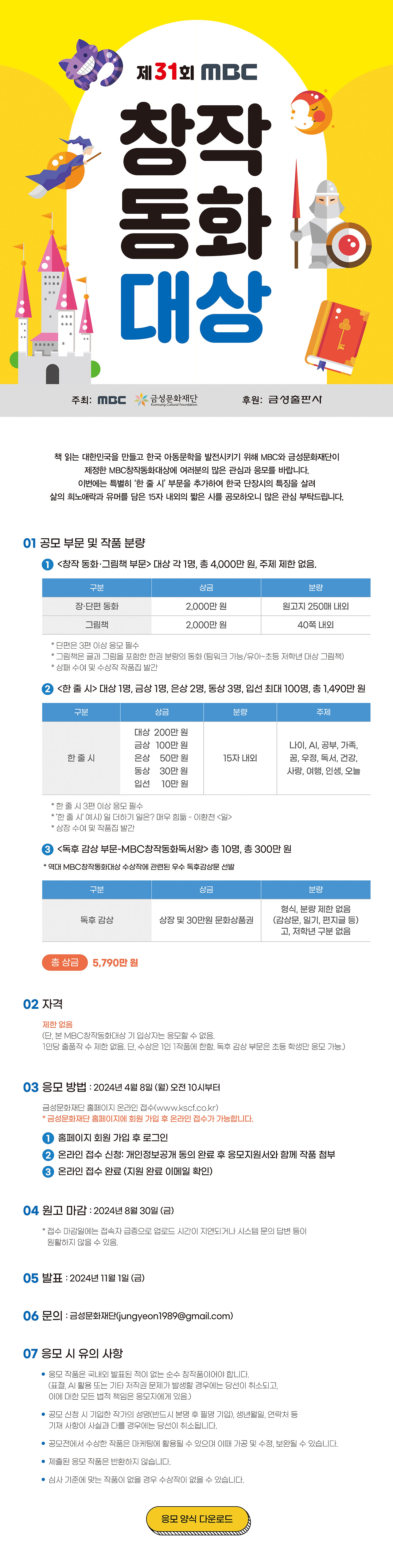 * 제31회 MBC 창작동화 대상 작성자최설운|작성시간24.03.23|조회수16 목록 댓글 0 글자크기 작게가 글자크기 크게가 다음검색 현재 게시글 추가 기능 열기 북마크 공유하기 신고 센터로 신고 댓글 댓글 0 댓글쓰기 답글쓰기 댓글 리스트
