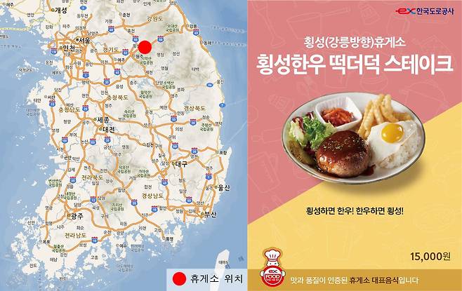 횡성휴게소(강릉 방향) 횡성한우 떡더덕 스테이크 - “소 한 마리를 집어삼킨 느낌과 부자가 된 듯 성취감이 든다”는 이영자 설명처럼 횡성의 명물 한우를 담은 스테이크다. 한우와 더덕을 함께 즐길 수 있는 고급 음식이다. 값은 휴게소 음식 중 비싼 편인 1만5,000원. 전참시, SBS 생방송 투데이에서 소개했고, 한국도로공사를 대표하는 EX-FOOD로 선정됐다.