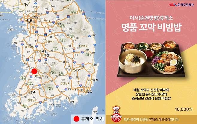 이서휴게소(순천 방향) 명품 꼬막 비빔밥 – 비빔밥 핵심은 밥이다. 맛있는 밥을 위해 이서휴게소에서는 직접 도정기를 설치해 정미소를 차렸다. 이 맛있는 밥을 바탕으로 꼬막과 삶은 달걀, 날치알, 다양한 채소를 곁들였다. 그리고 비법 한 가지 더. 일반 고추장이 아닌 유자청 고추장을 넣는다. 가격은 1만 원.