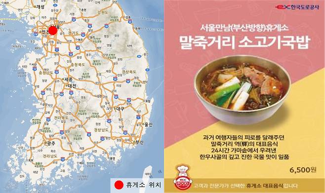 안성휴게소(부산 방향) 안성국밥, 소떡소떡, 맥반석 오징어 – ‘소떡소떡’ 붐이 시작한 곳이다. 그 유명한 명성만큼이나 이름난 먹거리도 다양하다. 지난 12월 전국 휴게소에서 4번째로 가장 많이 판매한 안성국밥, 전참시 이영자가 소개한 소떡소떡과 맥반석 반건조 오징어를 판매 중이다. 안성국밥으로 배를 채운 후 간식까지 먹을 수 있는 셈. 안성국밥은 한우를 전통방식으로 우려낸 국물 맛이 일품이며, 소떡소떡은 소시지와 떡볶이를 연이어 꼬치에 꽂은 음식이다. 값은 안성국밥 8,000원, 소떡소떡 3,500원, 맥반석 반건조 오징어 6,000원.