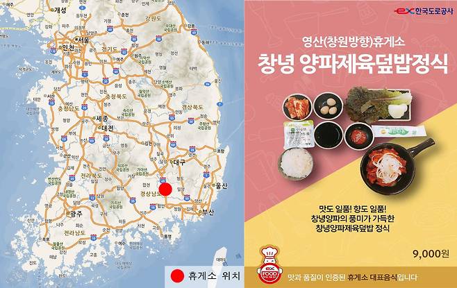 영산휴게소(마산 방향) 창녕 양파제육덮밥정식 – 양파는 창녕 대표 특산물이다. 풍부한 일조량과 미네랄 성분 높은 땅에서 자라 더 달짝지근한 맛이 나는 게 특징. 이런 창녕 양파를 제육 덮밥에 듬뿍 넣은 음식이 창녕 양파제육덮밥이다. 실제 후기에 따르면 양파가 큼직큼직하게 들어간다고. 값은 9,000원이다.