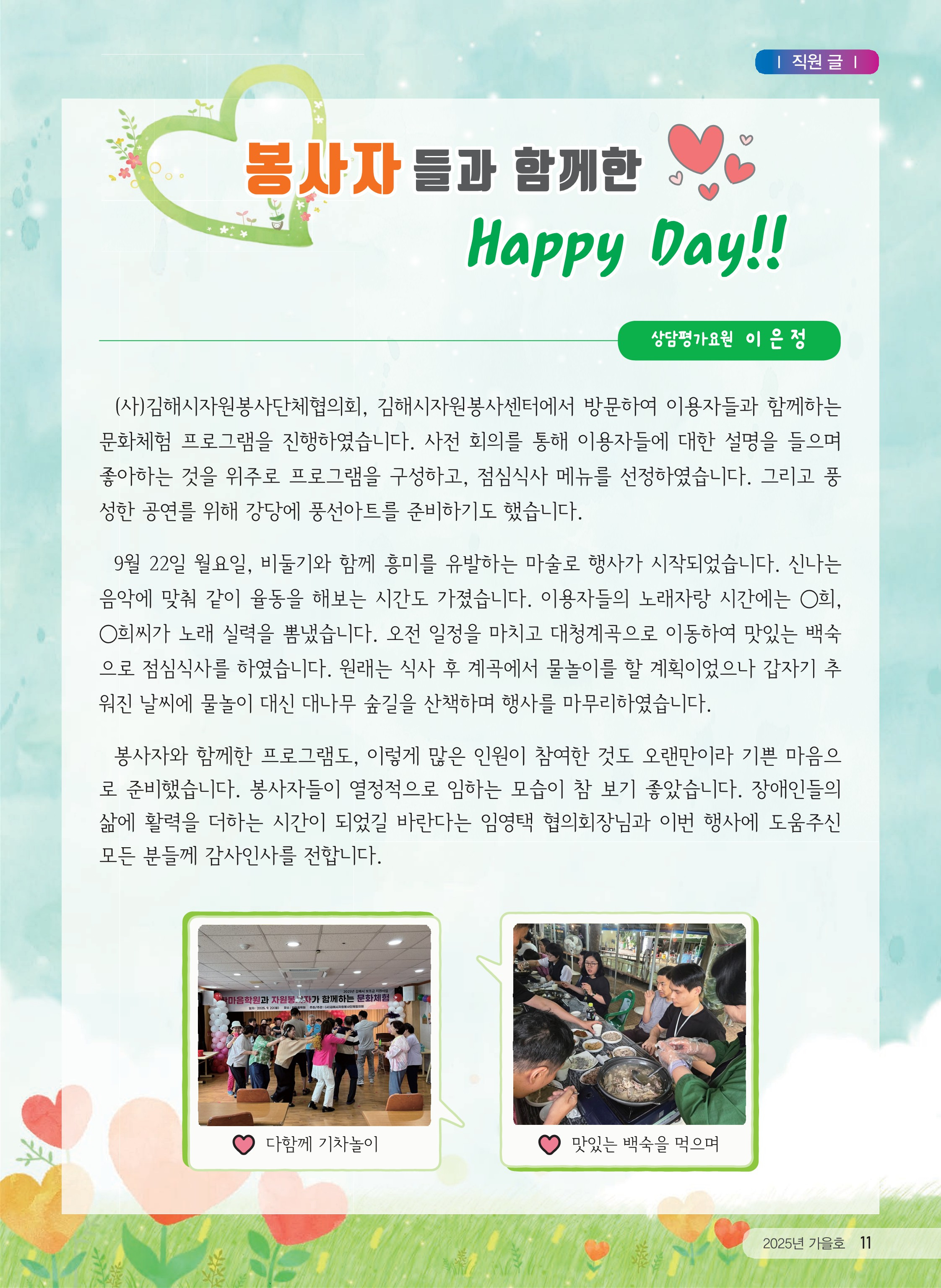 [직원]봉사자들과 함께한 Happy day!![상담평가요원 이은정] 작성자복지법인한마음|작성시간25.11.03|조회수45 목록 댓글 0 글자크기 작게가 글자크기 크게가 다음검색 현재 게시글 추가 기능 열기 북마크 신고 센터로 신고 댓글 댓글 0 댓글쓰기 답글쓰기 댓글 리스트