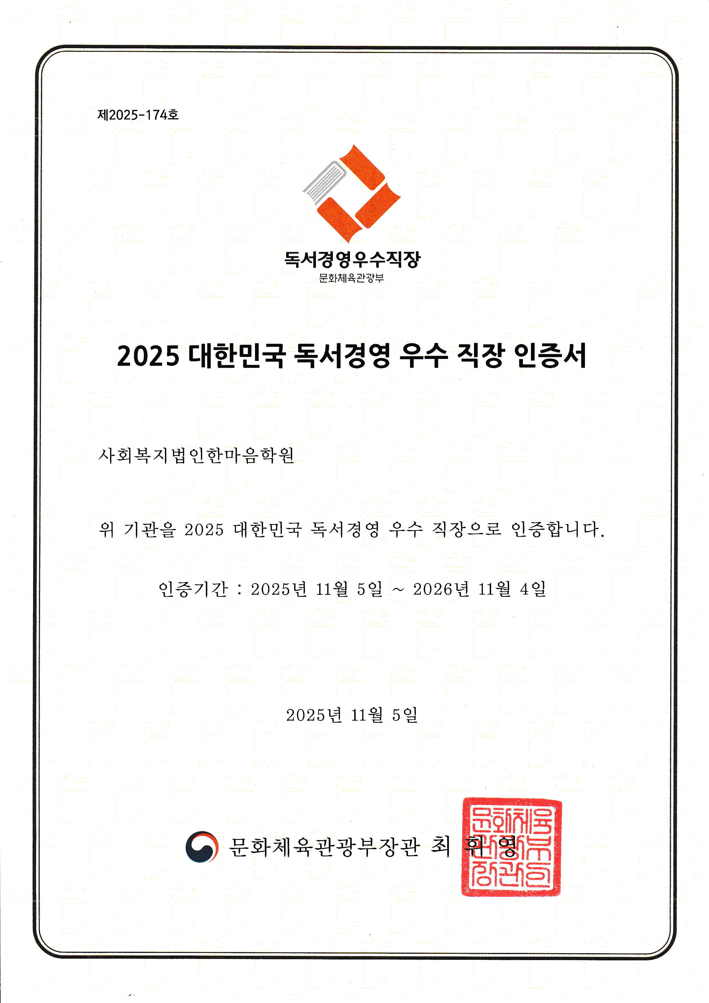 2019년부터 7년차 독서경영 우수직장 인증 중~!