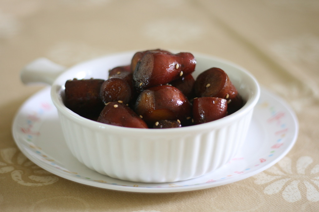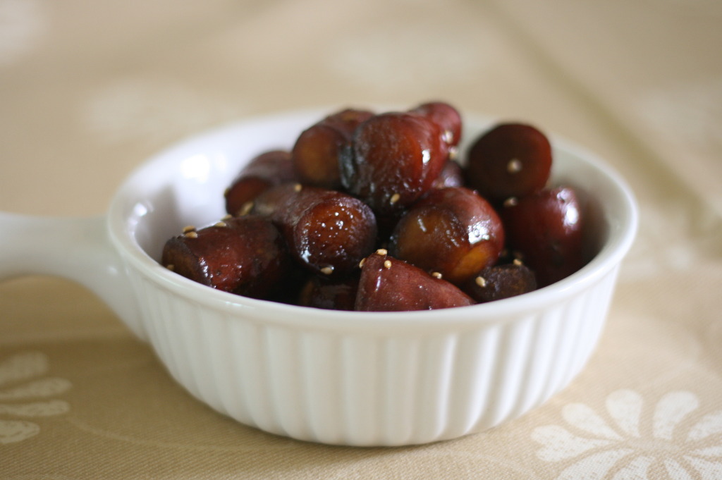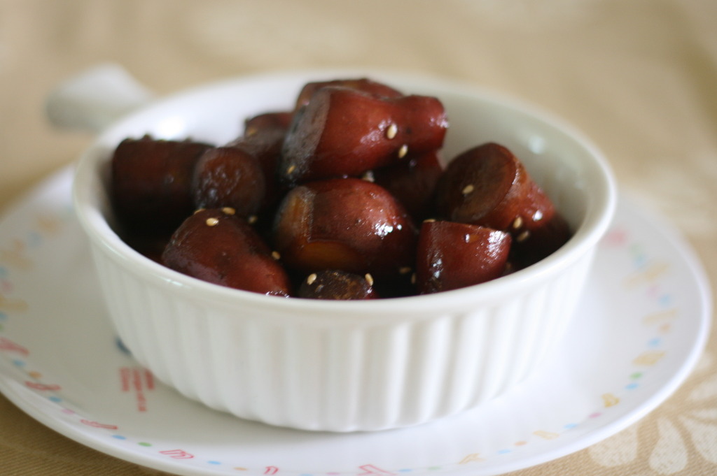 4 고구마에 윤기가 나면서 색과 간이 베이면서 국물이 졸아드들면 통깨와 참기름을 넣어 골고루 섞어서 그릇에 담는다.