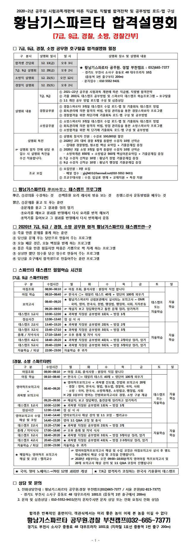 [2019년 마지막 설명회] 7급, 9급, 경찰, 소방, 군무원 단기합격 데스캠프 및 공부방법 설명회 - 12/20(금)~21(토) 작성자스파르타학원|작성시간19.12.01|조회수312 목록 댓글 0 글자크기 작게가 글자크기 크게가 다음검색 현재 게시글 추가 기능 열기 북마크 공유하기 신고 센터로 신고 댓글 댓글 0 댓글쓰기 답글쓰기 댓글 리스트