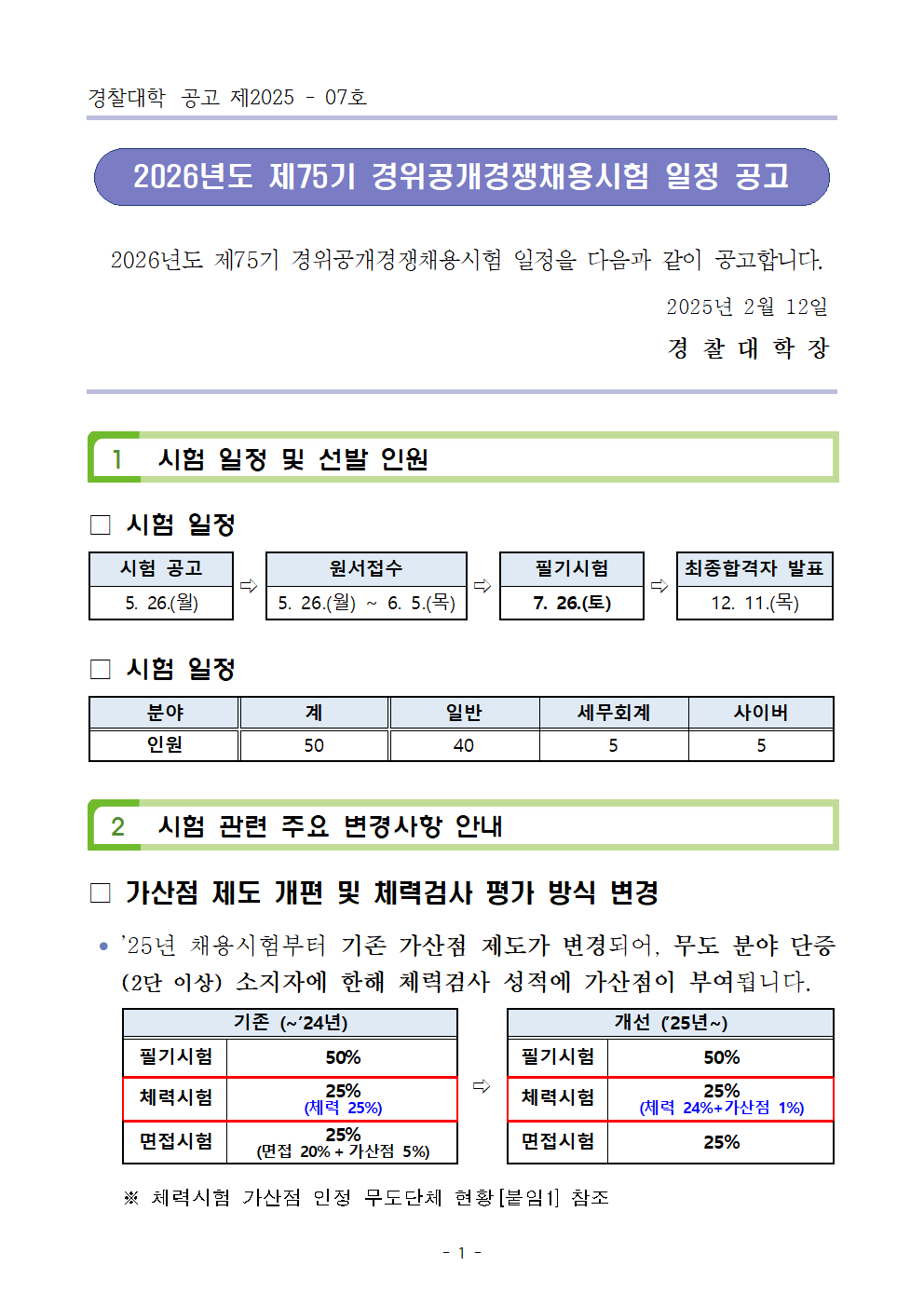 2026년도 제75기 경위 공개경쟁채용시험 일정 공고 작성자황남기합격캠프|작성시간25.02.12|조회수47 목록 댓글 0 글자크기 작게가 글자크기 크게가 2026년도 제75기 경위공개경쟁채용시험 일정 공고(최종).hwp329.50KB 첨부파일첨부된 파일이 2개 있습니다. bmp 파일 image001.bmp 다운로드 hwp 파일 2026년도 제75기 경위공개경쟁채용시험 일정 공고(최종).hwp 다운로드 다음검색 현재 게시글 추가 기능 열기 북마크 공유하기 신고 센터로 신고 댓글 댓글 0 댓글쓰기 답글쓰기 댓글 리스트