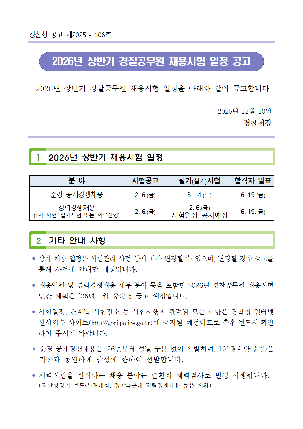 2026년 상반기 경찰공무원 채용시험 일정 공고 작성자황남기합격캠프|작성시간25.12.10|조회수55 목록 댓글 0 글자크기 작게가 글자크기 크게가 ★2026년 상반기 경찰공무원 채용시험 일정 공고문.hwp93.50KB 첨부파일첨부된 파일이 2개 있습니다. bmp 파일 image001.bmp 다운로드 hwp 파일 ★2026년 상반기 경찰공무원 채용시험 일정 공고문.hwp 다운로드 다음검색 현재 게시글 추가 기능 열기 북마크 공유하기 신고 센터로 신고 댓글 댓글 0 댓글쓰기 답글쓰기 댓글 리스트