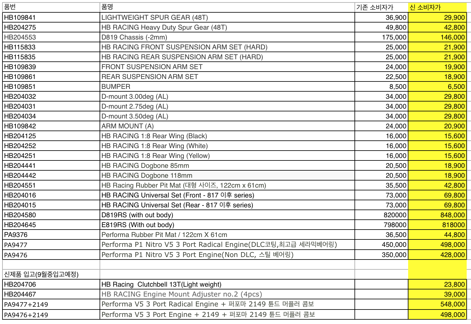 1. 제품 설명 :: HB레이싱, 퍼포마 제품 일부 가격 변동 및 엔진 콤보 상품 안내