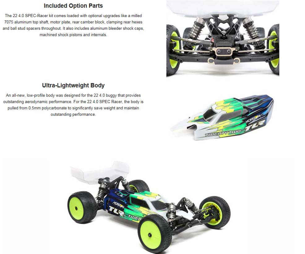 The 22 4.0 SPEC-Racer kit comes loaded with optional upgrades like a milled 7075 aluminum top shaft, motor plate, rear camber block, clamping rear hexes and ball stud spacers throughout. It also includes aluminum bleeder shock caps, machined shock pistons and internals.