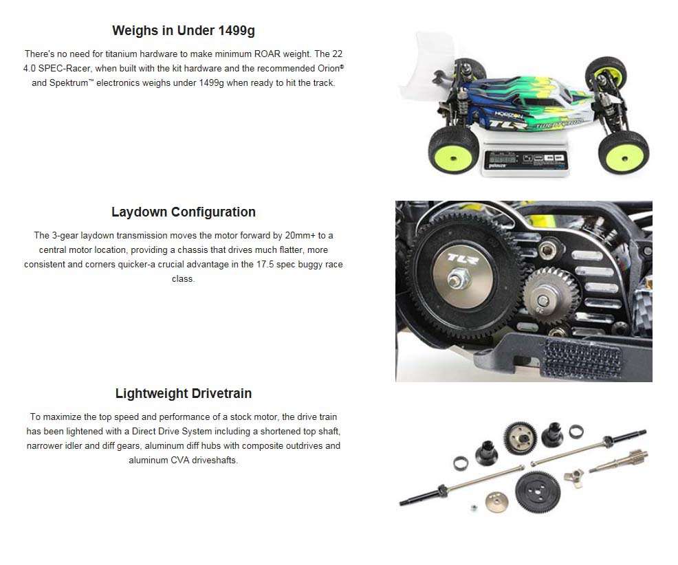 There's no need for titanium hardware to make minimum ROAR weight. The 22 4.0 SPEC-Racer, when built with the kit hardware and the recommended Orion® and Spektrum™ electronics weighs under 1499g when ready to hit the track.