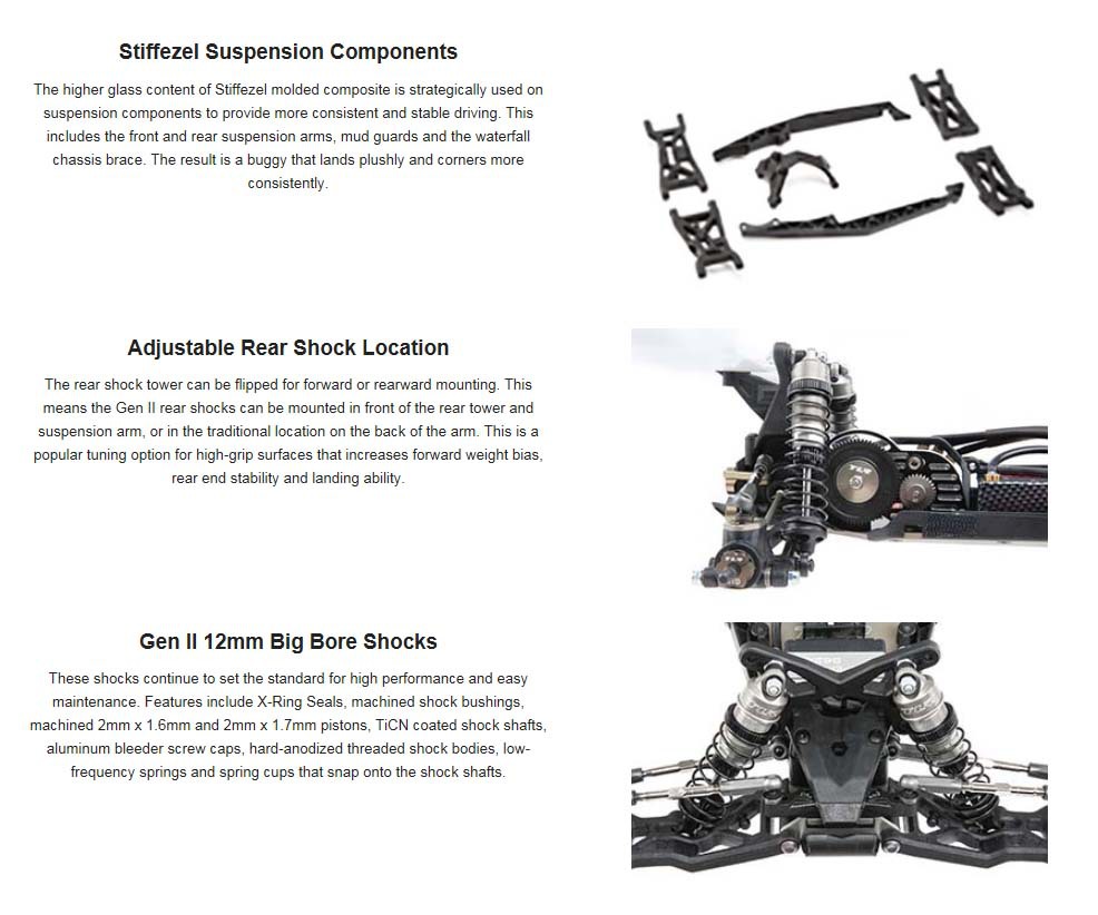The higher glass content of Stiffezel molded composite is strategically used on suspension components to provide more consistent and stable driving. This includes the front and rear suspension arms, mud guards and the waterfall chassis brace. The result is a buggy that lands plushly and corners more consistently.