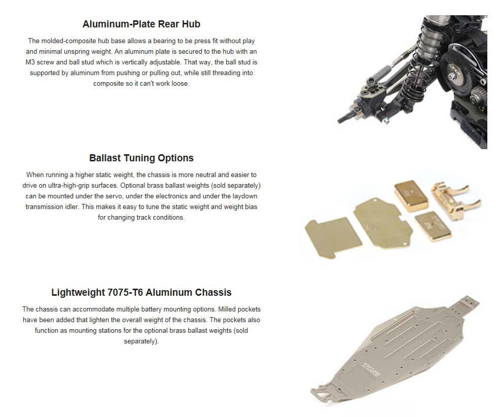 When running a higher static weight, the chassis is more neutral and easier to drive on ultra-high-grip surfaces. Optional brass ballast weights (sold separately) can be mounted under the servo, under the electronics and under the laydown transmission idler. This makes it easy to tune the static weight and weight bias for changing track conditions.