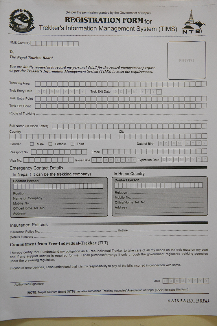이것은 트레킹하는 사람들이 TIMS 라고 부르는 허가서 양식....