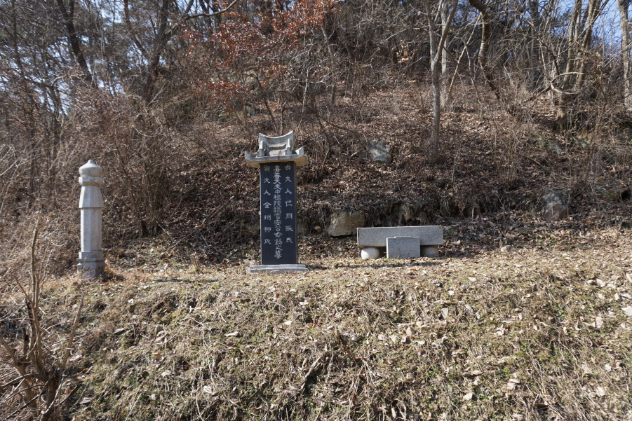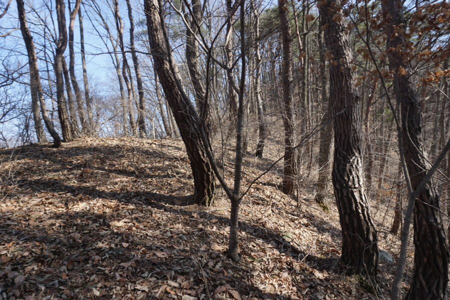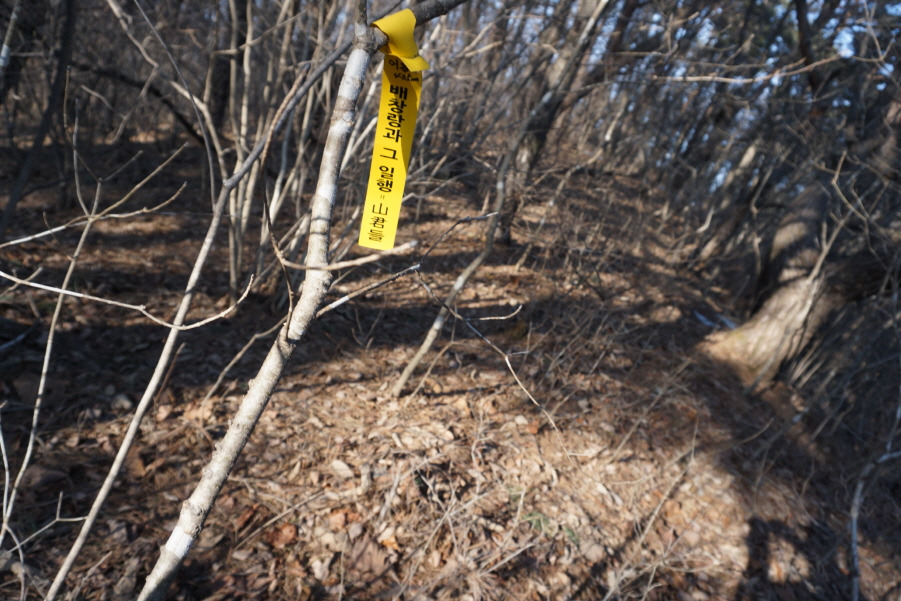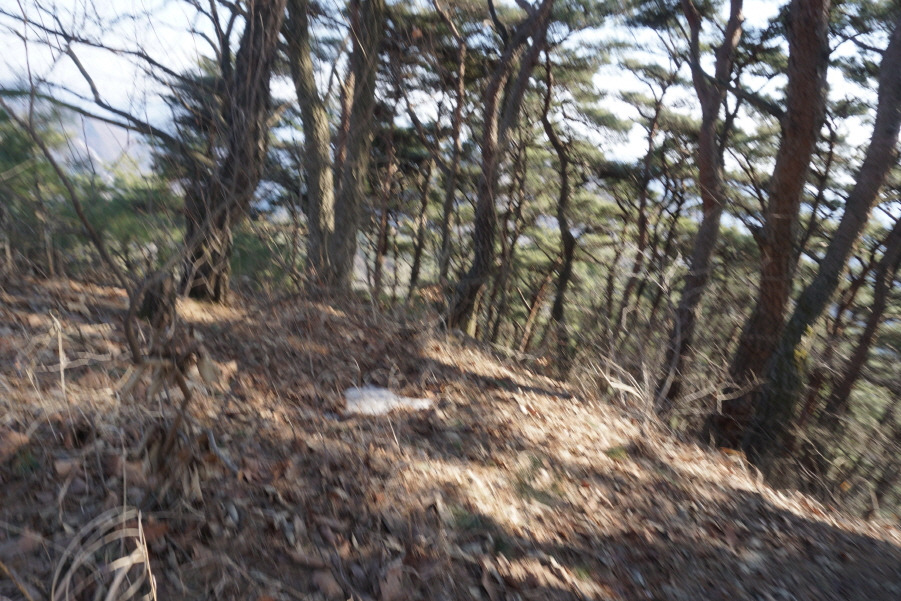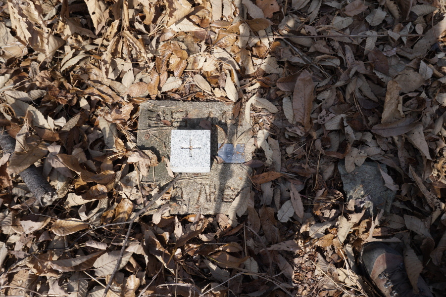 (11;11) 마을 도로 따르다가 "인동장 씨와 그 부인 묘지"가 있는 우측 임도 따르고, 임도가 끝날즈음(?) 좌측능선으로 희미한 족적 따라 쉽게 붙어 오른다. 등로가 좋아 의아하게 생각했는데 묘지로 오르는 길이다.