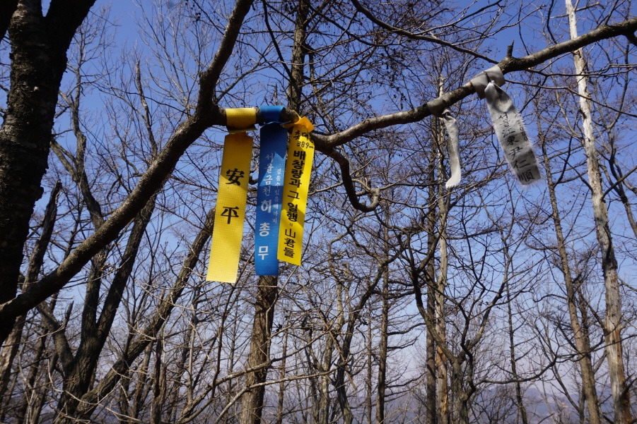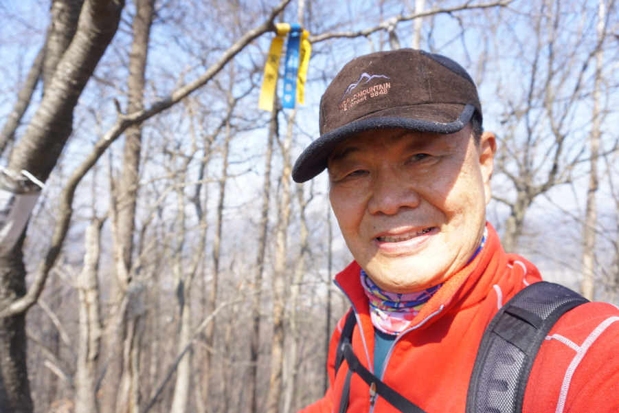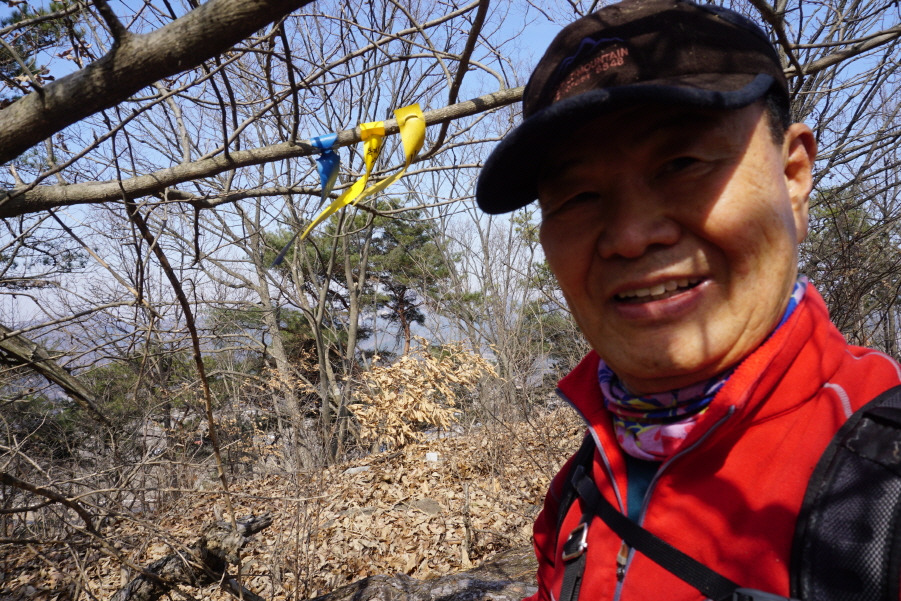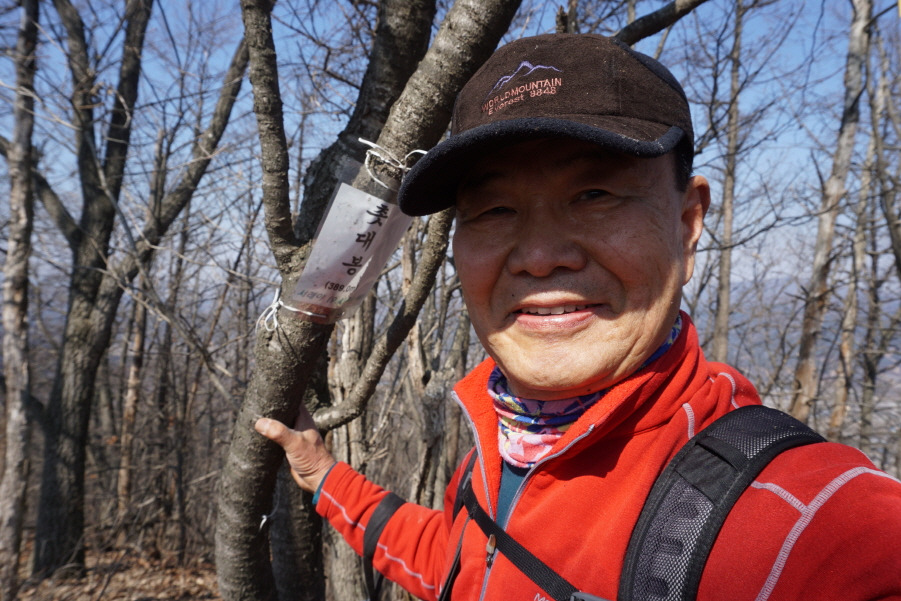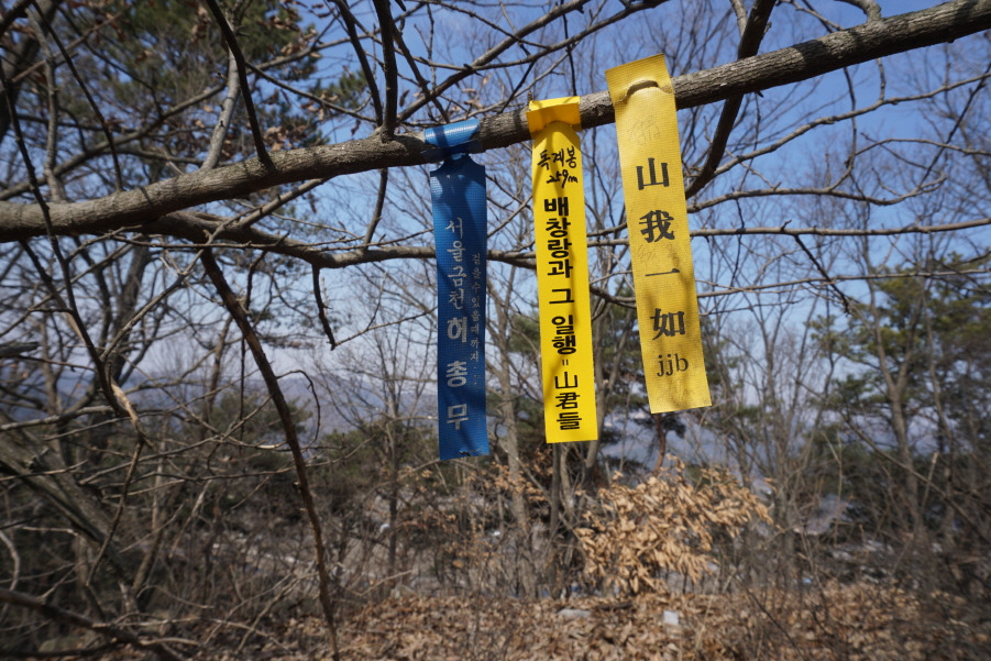 갈등날봉에서 0.3km 거리인데 중간에 잔설이 있는 암봉을 조심스럽게 오른 후 내려서 만나는 탓으로 시간이 20분이나 소요된다.故 서래야 박건석 님 비닐코팅 표지판 부착되어 있고 , 오래전 청산수 팀들의 윤인순 여사님 표지기는 낡은 모습으로 걸려 있고 , 만 산회팀들 허총무님 표지기기가 가지채 불러져 걸려있어 안평님 표지기 옆에 새로 부착하고 "배창랑과 그 일행 =山君들" 표지기 부착한다.