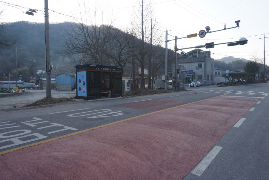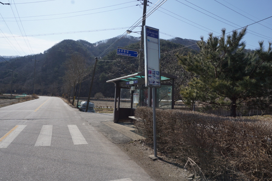 (11;05) 송운동 버스정류소입니다. 55번 도로에서 도로교통표지판 "송운동길" 방향으로 들어갑니다