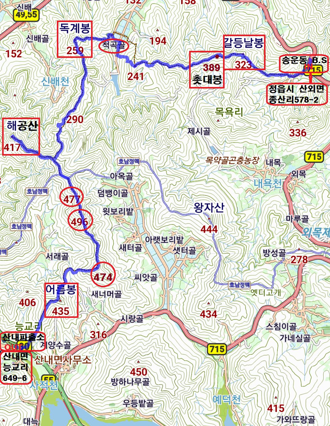 산행코스;송운동버스정류장[전북 정읍시 산외면 종산리 578-2)→ 송운동 → 임도→능선안부 →묘지길 →급경사 오름길 →갈등날봉(323) →바위암봉 →촛대봉(389) →척곡골 →독계봉(259) →급경사 내리막길 →능선 →290봉 →415봉(해공산 왕복) →416봉 →해공산(417△) →415봉 →호남정맥 →477봉 →496봉 →475봉 →435봉 →474봉 →350봉 →어름봉(435) →산내파출소(정읍산내면 능교리)