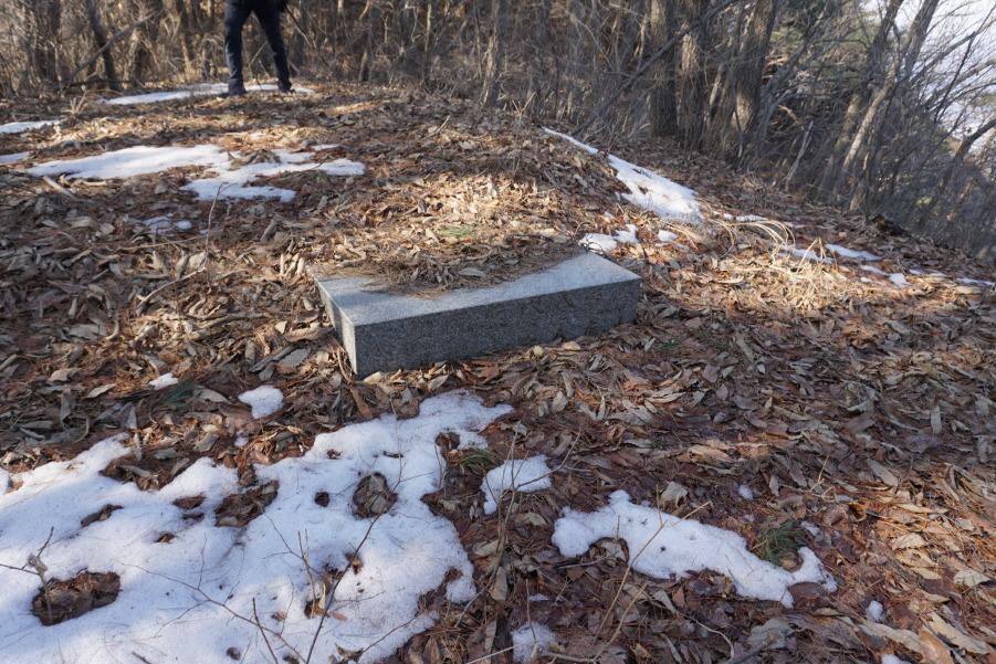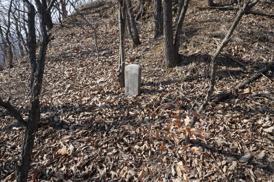 (14;43) 해공산(417) 직전 봉분 없는 광주 정 씨 묘비입니다. 이 깊은 골짜기 능선에 성묘올 후손이 없어 봉분은 없어지고 묘비만 살아남은 듯싶습니다