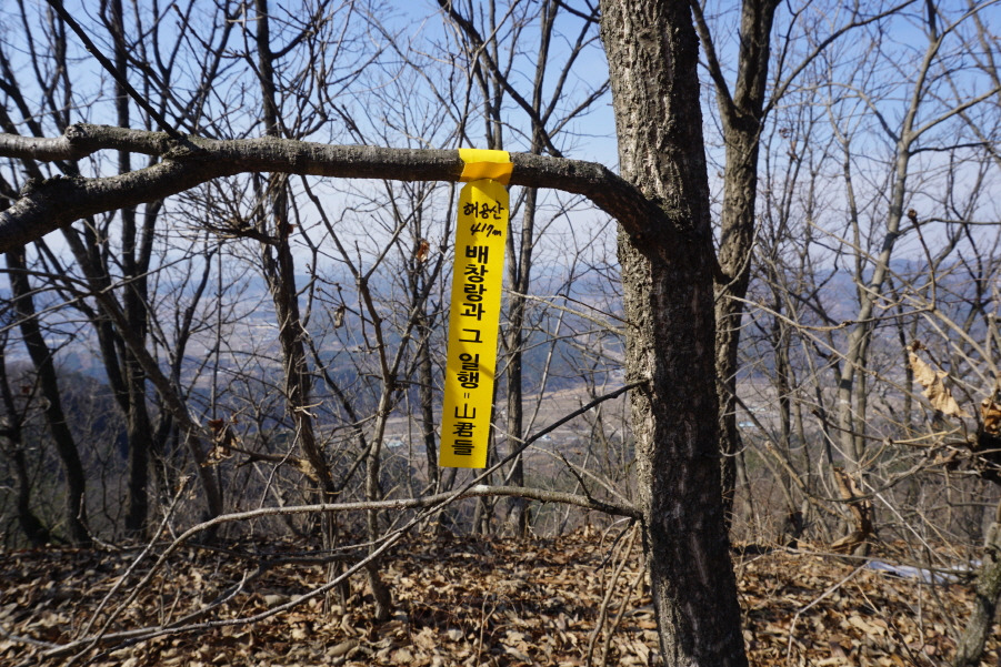 (14;44) 해공산(417m) 정상에 처음 부착되는 표지기 "해공산 417m/배창랑과 그 일행=山君들"입니다.