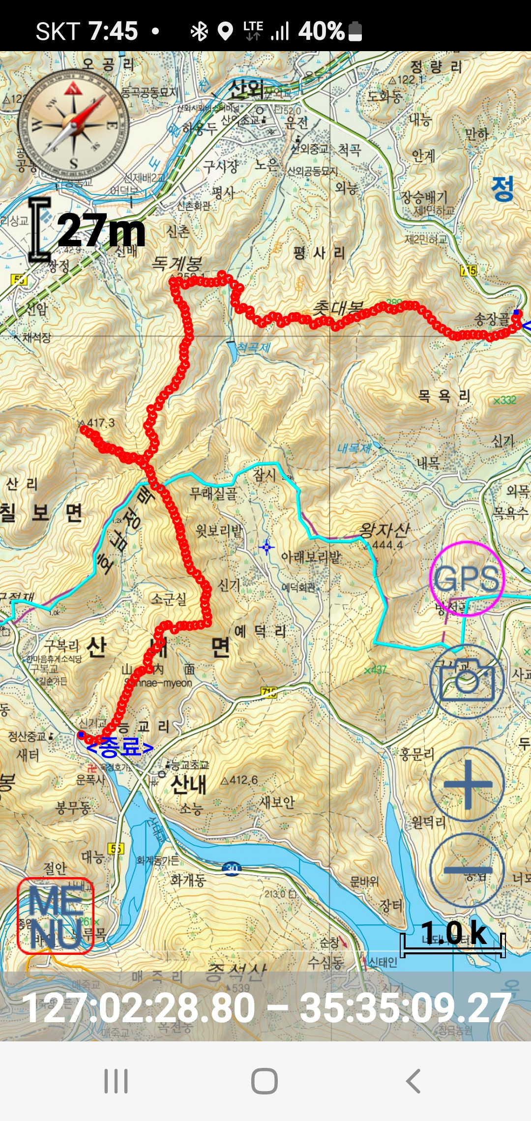 산내면 능교리 649-6 산내파출소 앞 슈퍼에서 산행종료한다. 감투봉 왕복은 꿈도 못 꾼다. 시간 내 무사히 산행종료할 수 있음에 하나님께 감사한다.