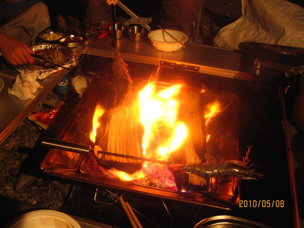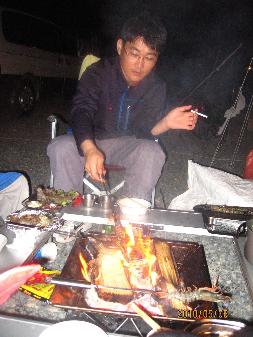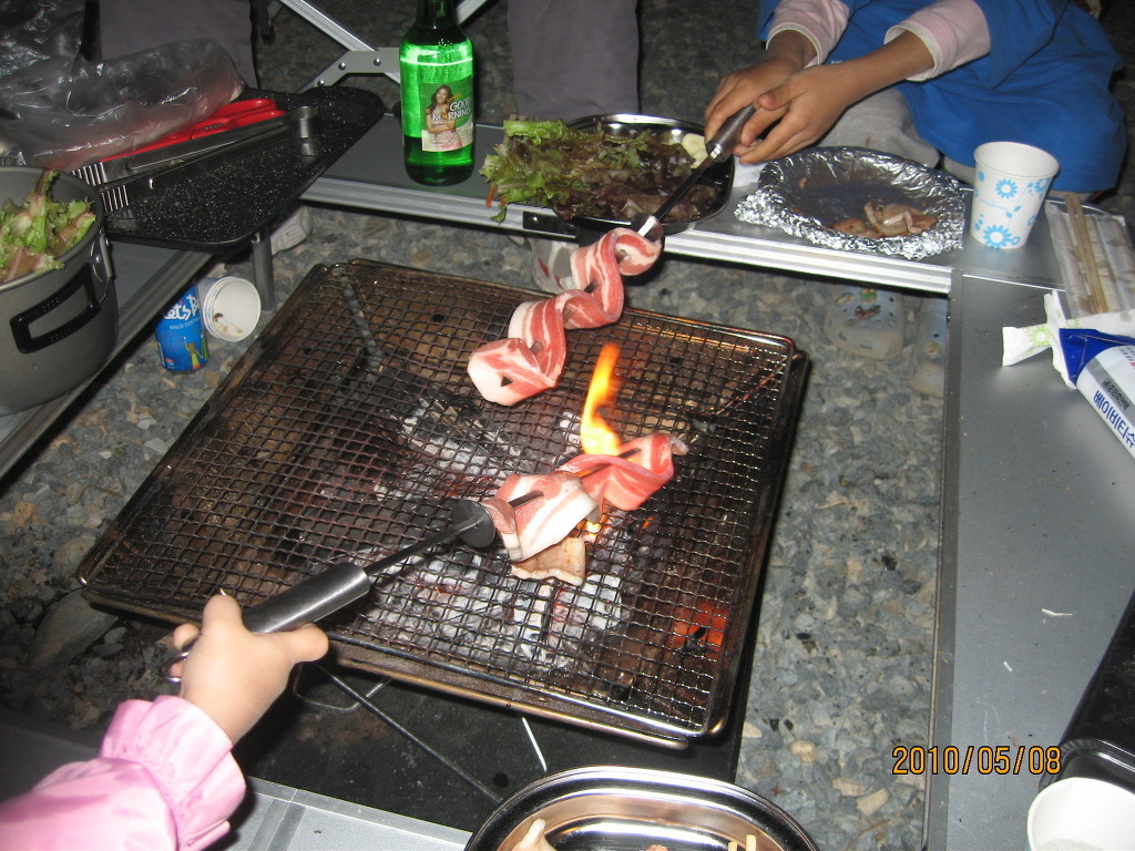 삼겹살은 그을림 때문에 숯불을 사용했고, 새우는 껍질이 있어 장작불에 구워도 괜찮았다.