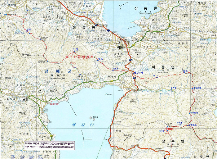 100m 가량 낮췄다가 다시 올라선 봉에는 [상수원보호구역/남면] 하얀 말뚝이 박혀있고 우측으로 귀비산 능선이 갈라지는데 남해읍과 남면이 갈라진다. 왼쪽은 이동면이니 말하자면 삼면봉이 된다. 남면 면계를 따라 짚어보니 천황산이 보인다. 그 말 많던 천황산(天皇山 △395.2)이 남해에도 있었네.