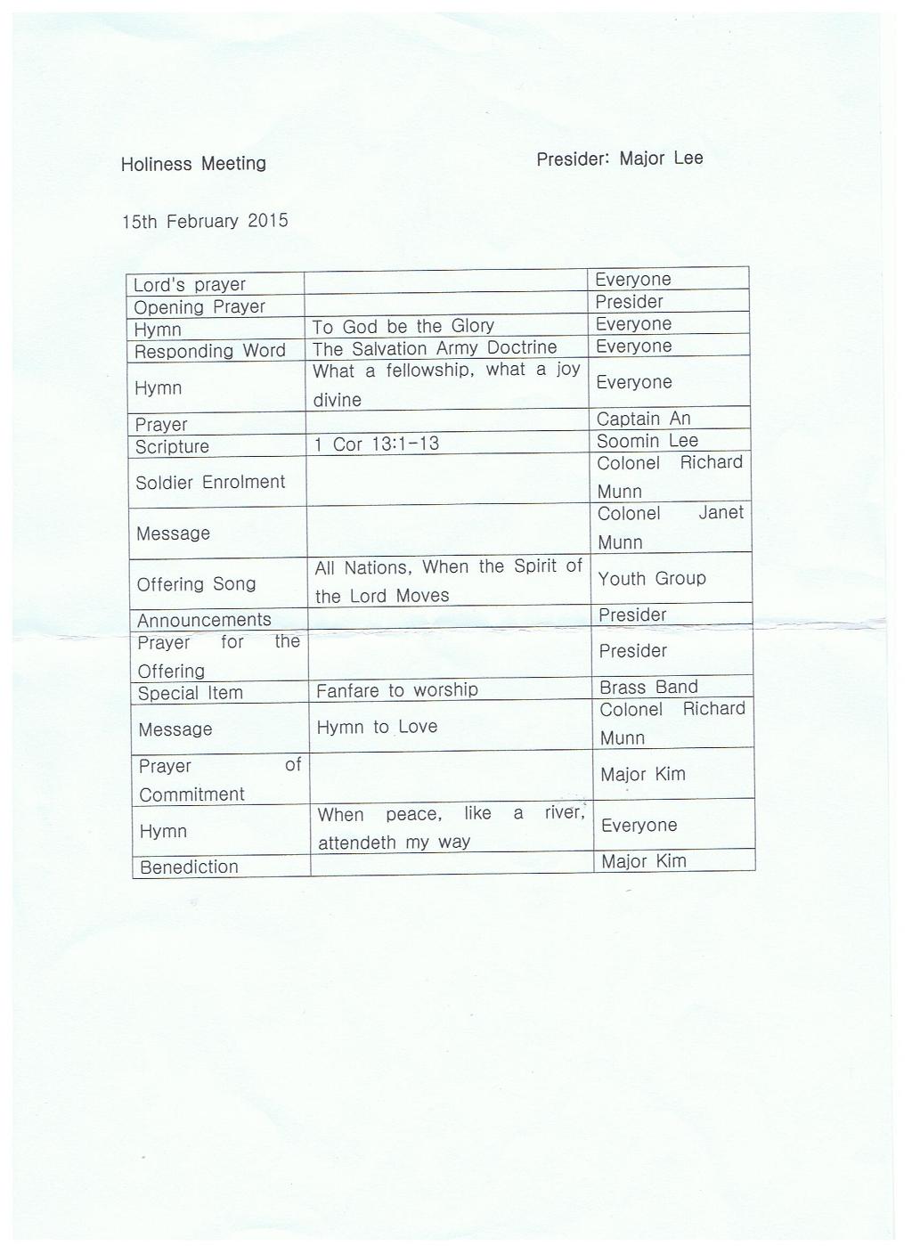 서기장관인 Richard Munn 사관은 고린도전서 13장의 말씀을 의지하여, '사랑의 송가'(Hymn to Love)란 제목으로 '사랑은 필수적이다'(Love is Essential), '사랑은 실천적이다'(Love is Practical), '사랑은 영원하다'(Love is Permanent)고 했다. "사도바울이 선포한 사랑은 신약시대에 가장 문제가 많았던 교회를 향한 글이었다. 상황을 알지 못하고 이 글을 읽는다면 사랑의 본질적인 의미를 깨닫지 못하게 된다." 사랑이란 추상적인 관념이나 이상이 아닌 '사랑은 행동'임을 강조하였다.