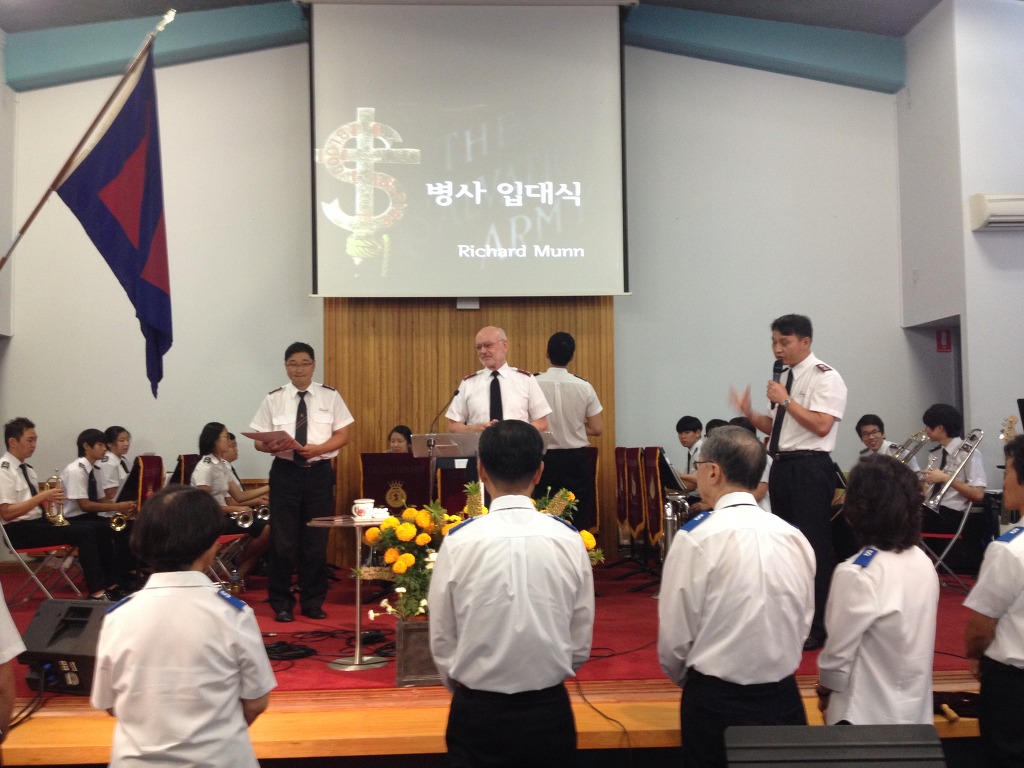 구세군 한인교회(담임사관 이한상. 허성은)에서는 지난 2월 15일(주일) 호주 구세군 '서기장관 동부인'(Colonels Richard and Janet Munn)을 모시고, 오전 11시에 ‘창립 19주년 기념예배’를 드렸다. 특별히 이날 ‘병사 입대식’도 있었다. 구세군에 정식으로 등록 되고자 하는 사람은 반드시 입대식을 통하여 서약서에 사인을 해야 한다. 병사 서약서의 내용은 구세군 병사가 준수해야 할 구세군 교리, 구세군 병사로서 마땅히 지켜야 할 윤리적이고 실천적인 사항들이 명시되어 있다. 4 주간 성서와 구세군 교리를 배우고 입대하는 10명의 병사들은, 서약 후 서기장관으로부터 ‘병사 입대 증서’를 수여 받았다. 사관학교 교장인 Janet Munn 사관은 격려사를 통하여, 세계 126개 국가에서 활동하는 구세군의 병사가 된 것을 축하하면서, 그리스도의 좋은 병사가 되어 선한 싸움을 싸워 줄 것을 당부하였다.