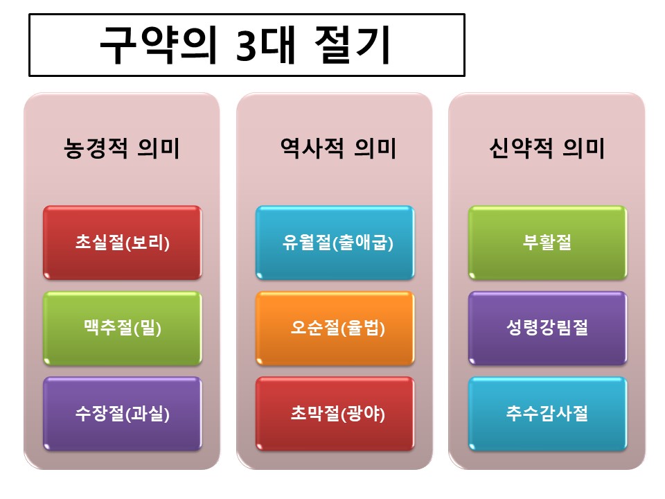 성경은 예수 그리스도에 관한 책이다. 구약은 오실 예수 그리스도, 신약은 오신 예수 그리스도. 구약에는 3번의 절기가 있다. 유대인 20세 이상이 된 남자는 어느 곳에 살고 있든지 이 절기 때에는 반드시 예루살렘에 가서 제사를 들여야 한다. 구약의 절기는 예수 그리스도의 대속, 부활 그리고 성령강림과 밀접한 관계가 있다.