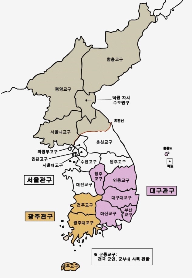 1995년 현재 서울 관구에(북한의 3개를 포함하여 9개 교구, 대구 관구에 5개 교구,광주 관구에 3개 교구가 배속되어 있다.