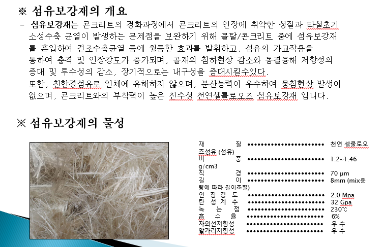 섬유보강재는 레미콘회사에서 투입하여 시공되기 때문에 간편하고 비중이 1.2이기 때문에 물에 떠오르지도 않고 콘크리트에 골고루 섞여서 타설이 됩니다.와이어메시 대비 비용도 절감되고 우리나라에서도 대기업 현장에서 20년 이상 입증된 제품입니다.