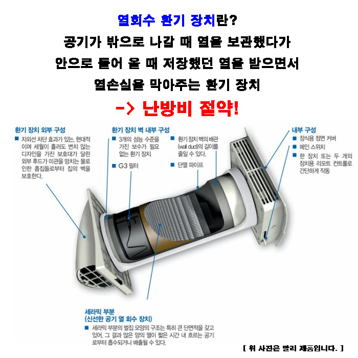 위의 사진에도 나와있듯이 전열교환기는 환기(급기,배기)를 하면서 열을 저장하면서 열손실을 막아주는 환기장치입니다. 환기는 물론이고 난방비를 절약해주는 효과가 있습니다.