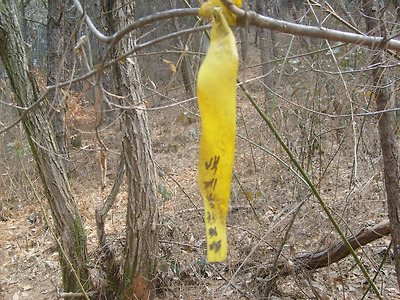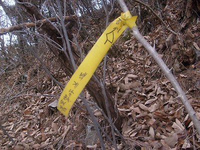아래그림/묘지를 지나 급경사 오르기전의 본인 표시기임.2004년12월2일 표시기임.여기서 급경사7분 오르면 묘1기고 이후는 편안한 능선임(소나무숲길)