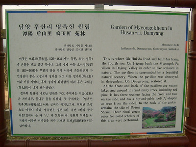 아래그림/명옥헌의 설명안내판임.여기서 다시 이정표 삼거리로 내려간후 [은행나무]쪽으로 올라간다.