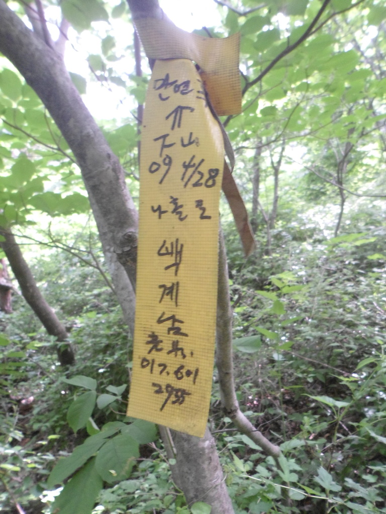 내려갈만하다.내표시기도 가끔보이고 2009년6월19일 로프설치표시기도 보인다.당시에는 산길이 없서서 포장끈로프를 3묶음