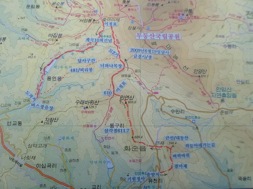 전남.화순[큰산/대동산(598.4)]//기원정사-질마재-큰산/대동산(598.4)-수레바위분기점-너와나목장-용추폭포-제2수원지-용연동12km7시간山行記
