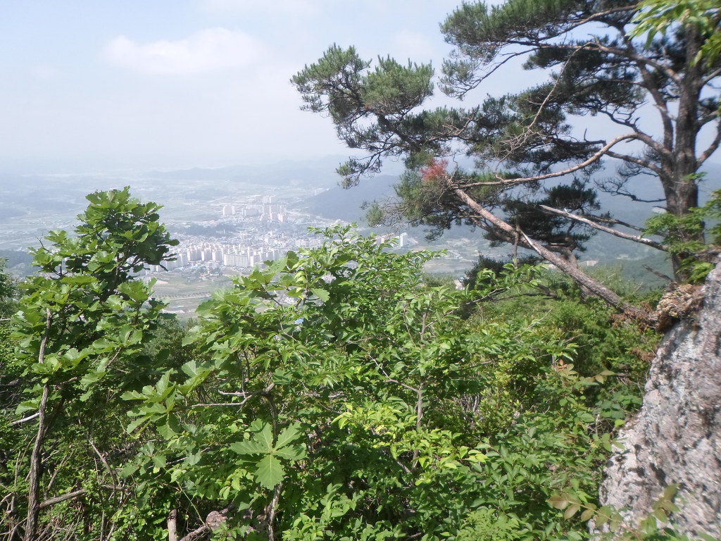 *10시42분이고 소나무를 끼고 있는 조망처바위에 도착을 한다.左로 화순시내가 내려다 보인다.조금위에 노란판에 [개천문]이라