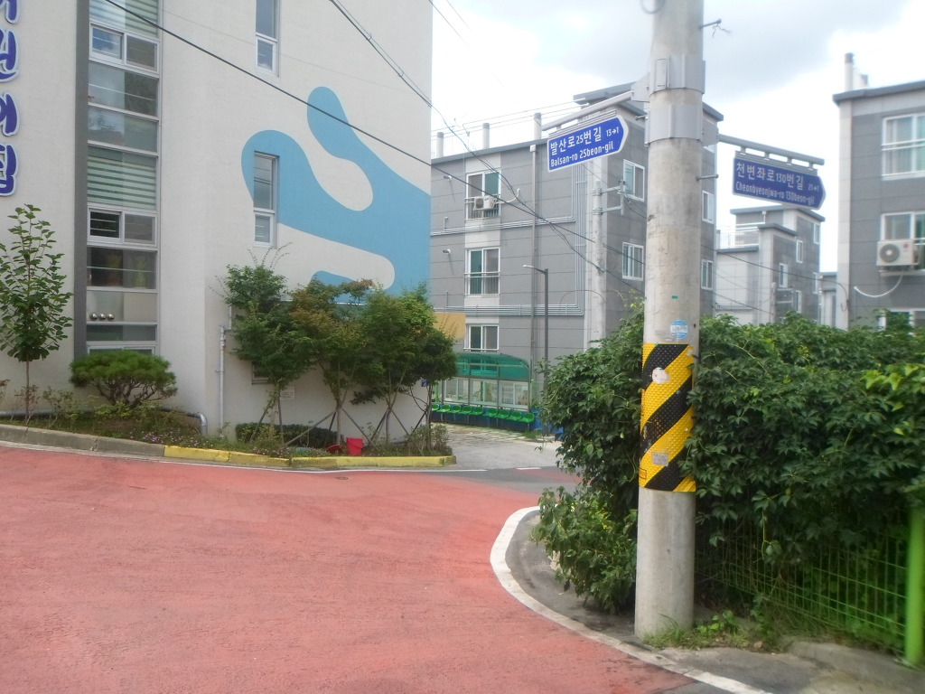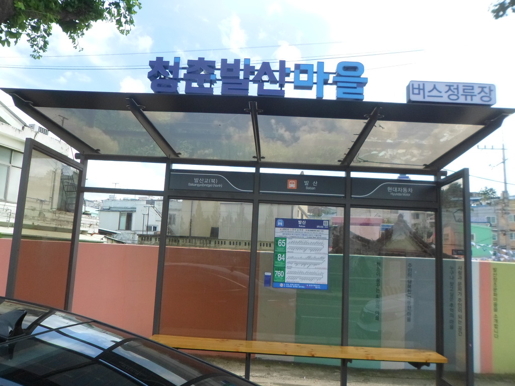 산광장]이 나오고 계속 진행하면 [샘물경로당]을 지나 천변좌로길로 올라선다.버스정유장인데 [청춘발산마을]정유장이다.바쁠것