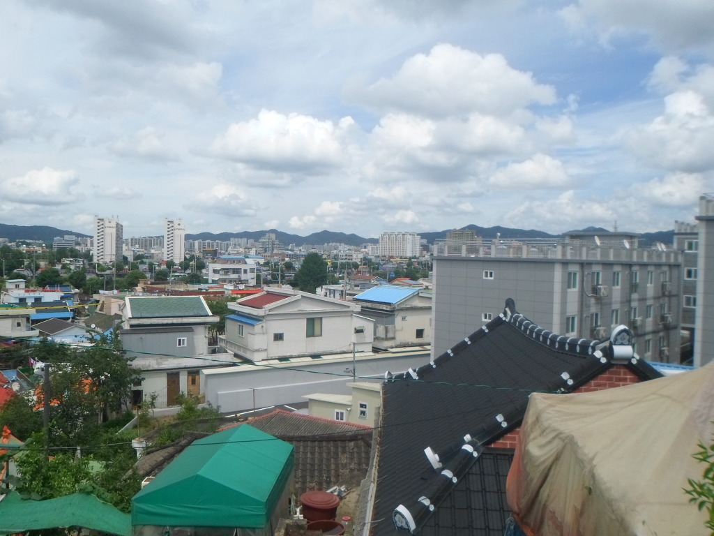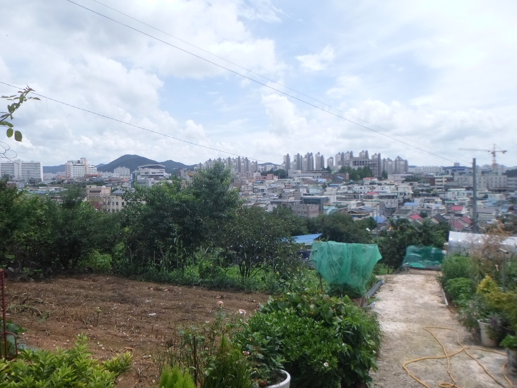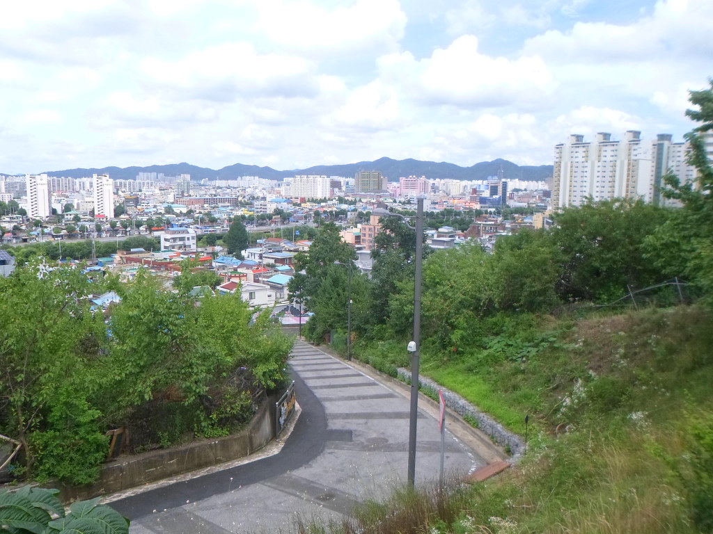 아래그림/고개마루 전망대 직전의 주택을 지나서 바라본 멀리 조망이 뛰어난 해발177.0m인 [개금산]이 보인다.